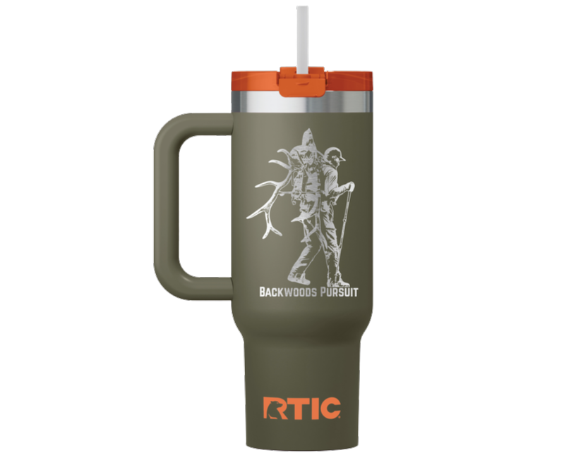 Backwoods Pursuit custom engraved RTIC Road Trip Traveler 30oz tumbler. This high quality tumbler offers multiple lid functions, compatible with most cup holders, keeps your beverage cold for up to 24 hrs, and is vacuum sealed and ceramic lined.